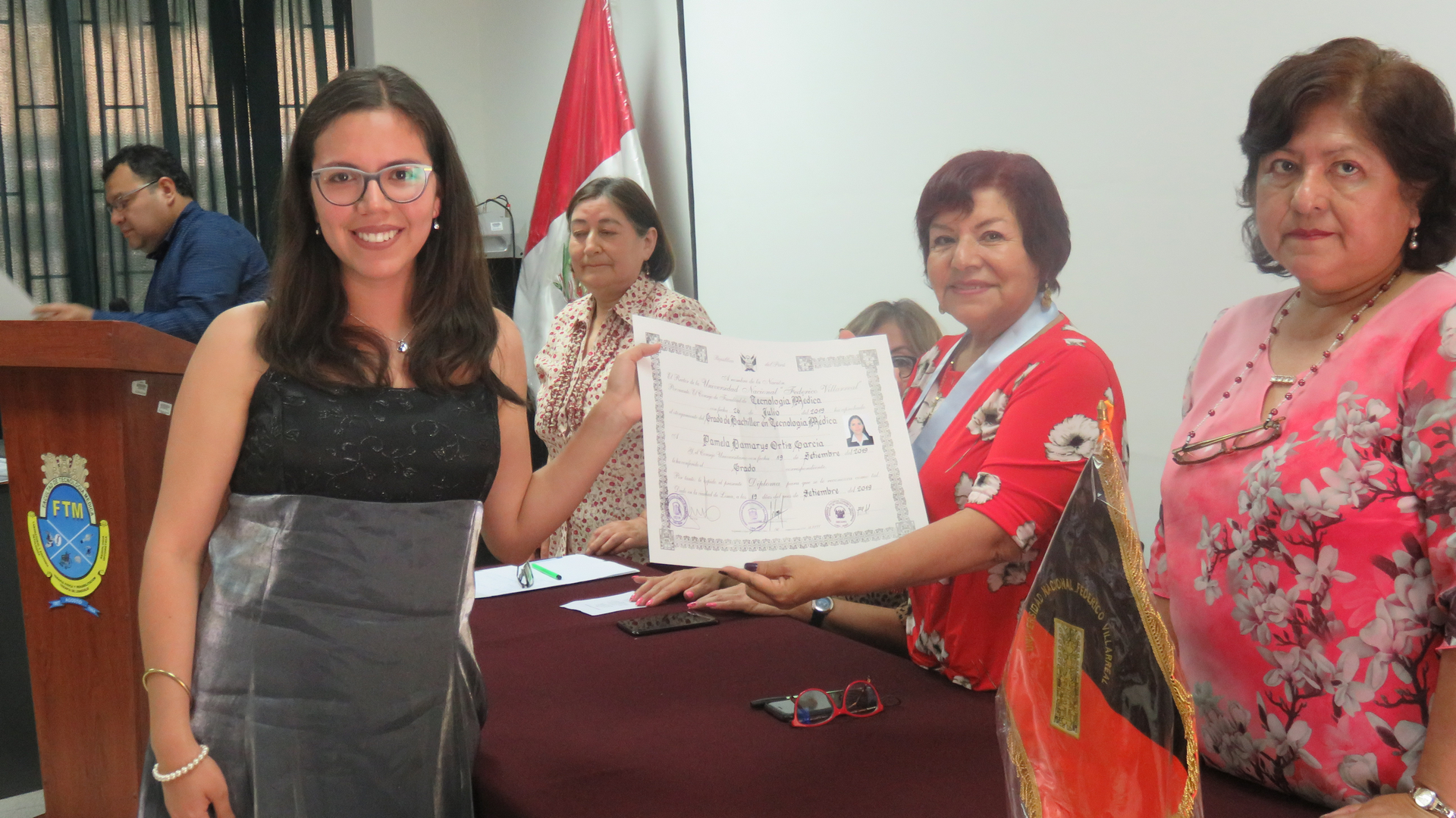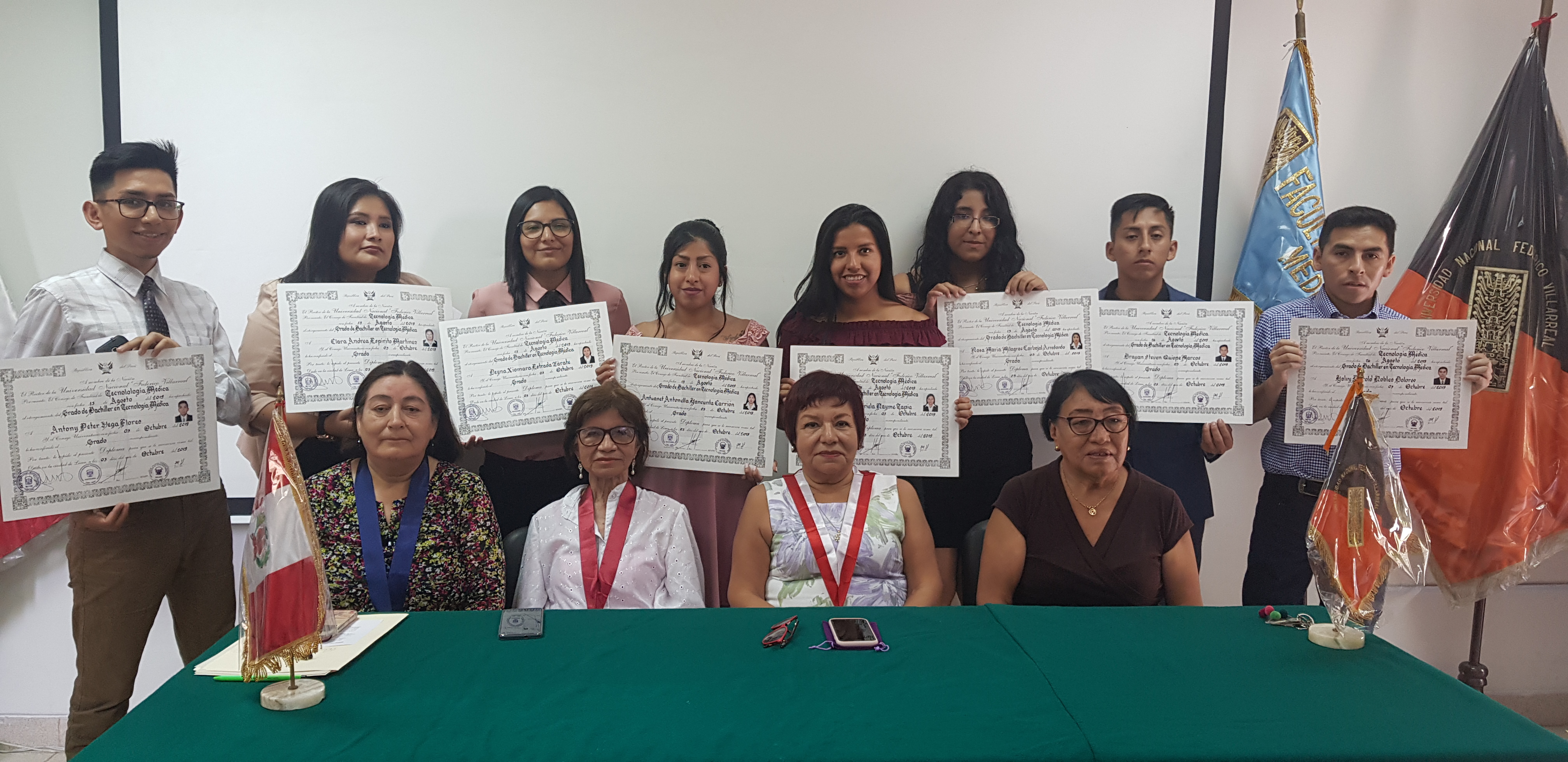 En la mesa de honor estuvieron presentes la Dra. Regina Medina Espinoza, decana, la Dra. Gloria Cruz Gonzales, directora del Departamento Acad茅mico, la Lic. Laura Matsuda Trinidad-Rojas en representaci贸n de la escuela de Radioimagen y la Lic. Soledad Rivera Linares, Jefa de la Oficina de Grados y T铆tulos.