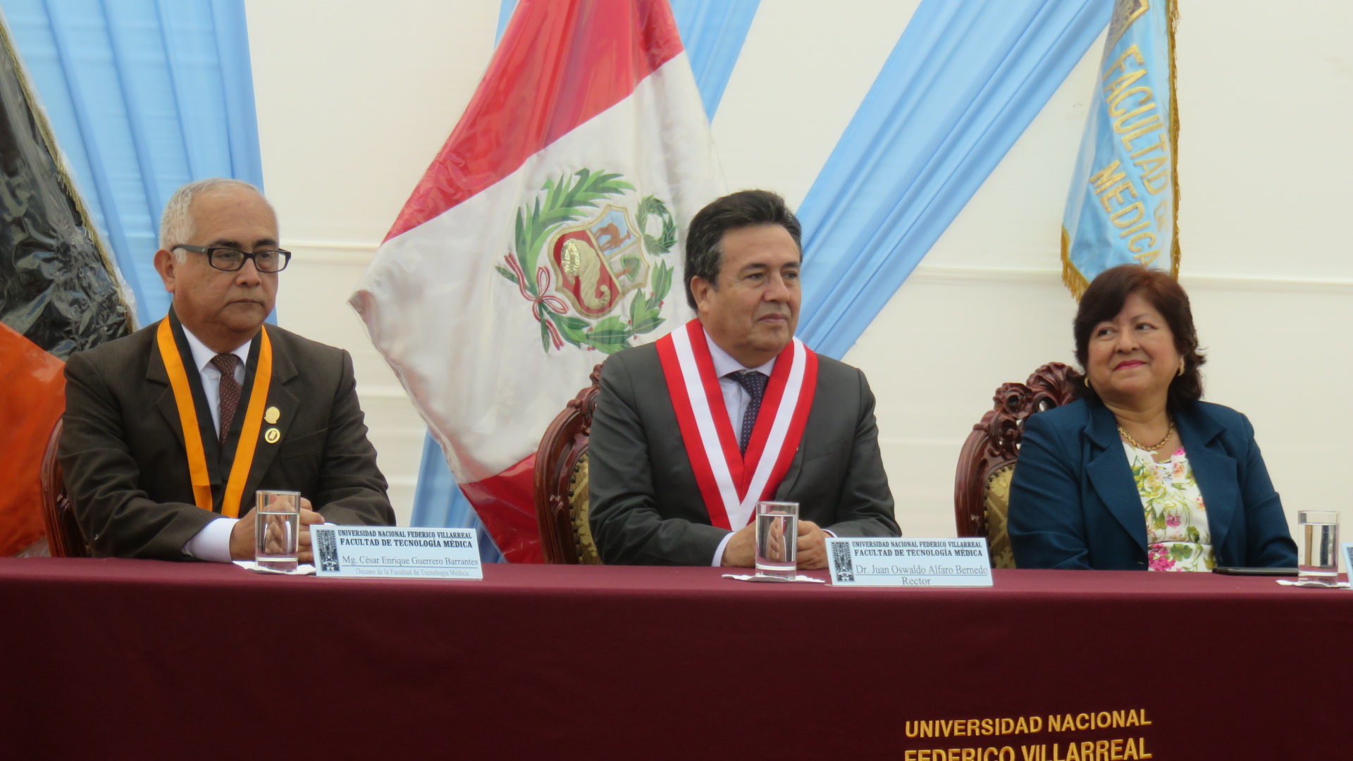 Presidi贸 el acto, el doctor Juan Oswaldo Alfaro Bernedo, rector de nuestra universidad; acompa帽ado por el mag铆ster C茅sar Guerrero Barrantes, decano de la FTM; y la doctora Gloria Cruz Gonzales, presidenta de la Comisi贸n de Aniversario de la facultad.