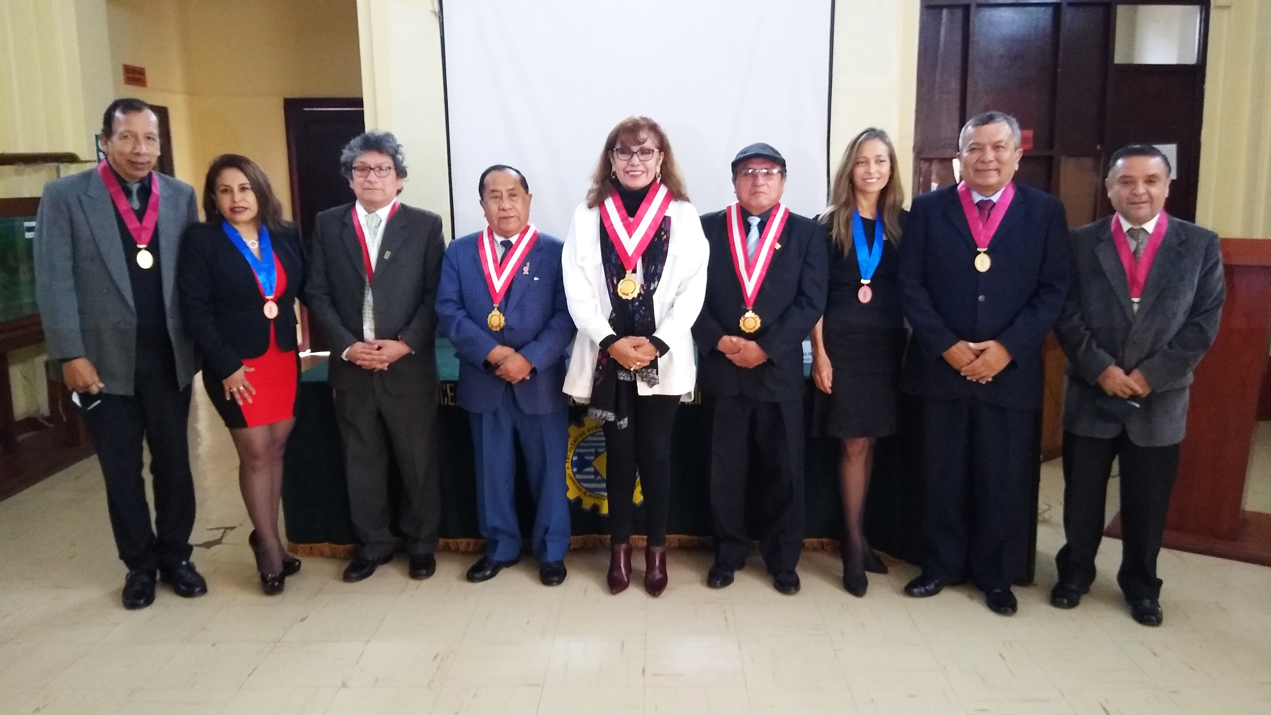 Imposición de medalla a nuestro docente Dr. Edwin José Lazo Chong; ascendido a la categoría de principal por parte de nuestra rectora Dra. Cristina Asunción Alzamora Rivero. |
