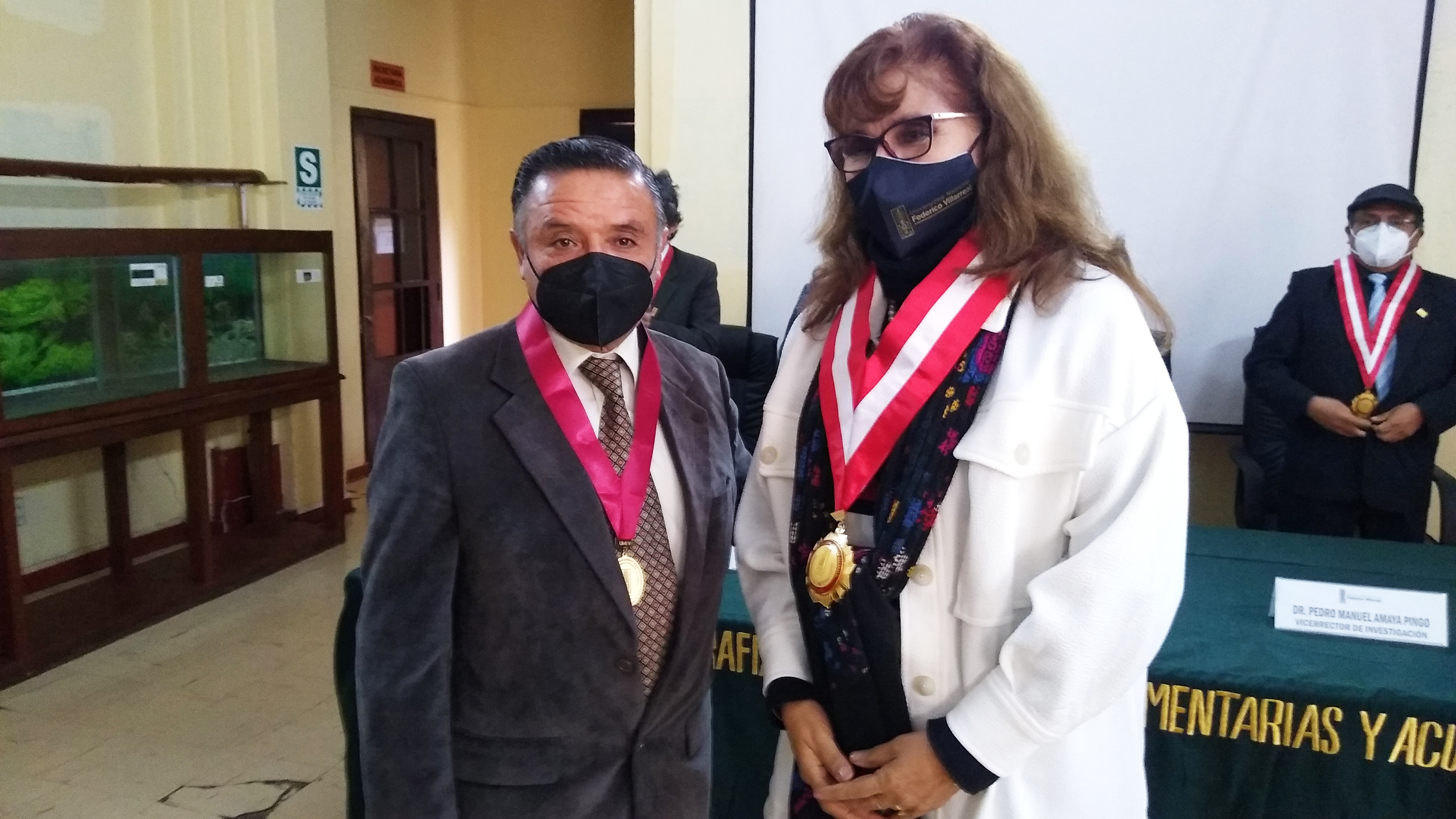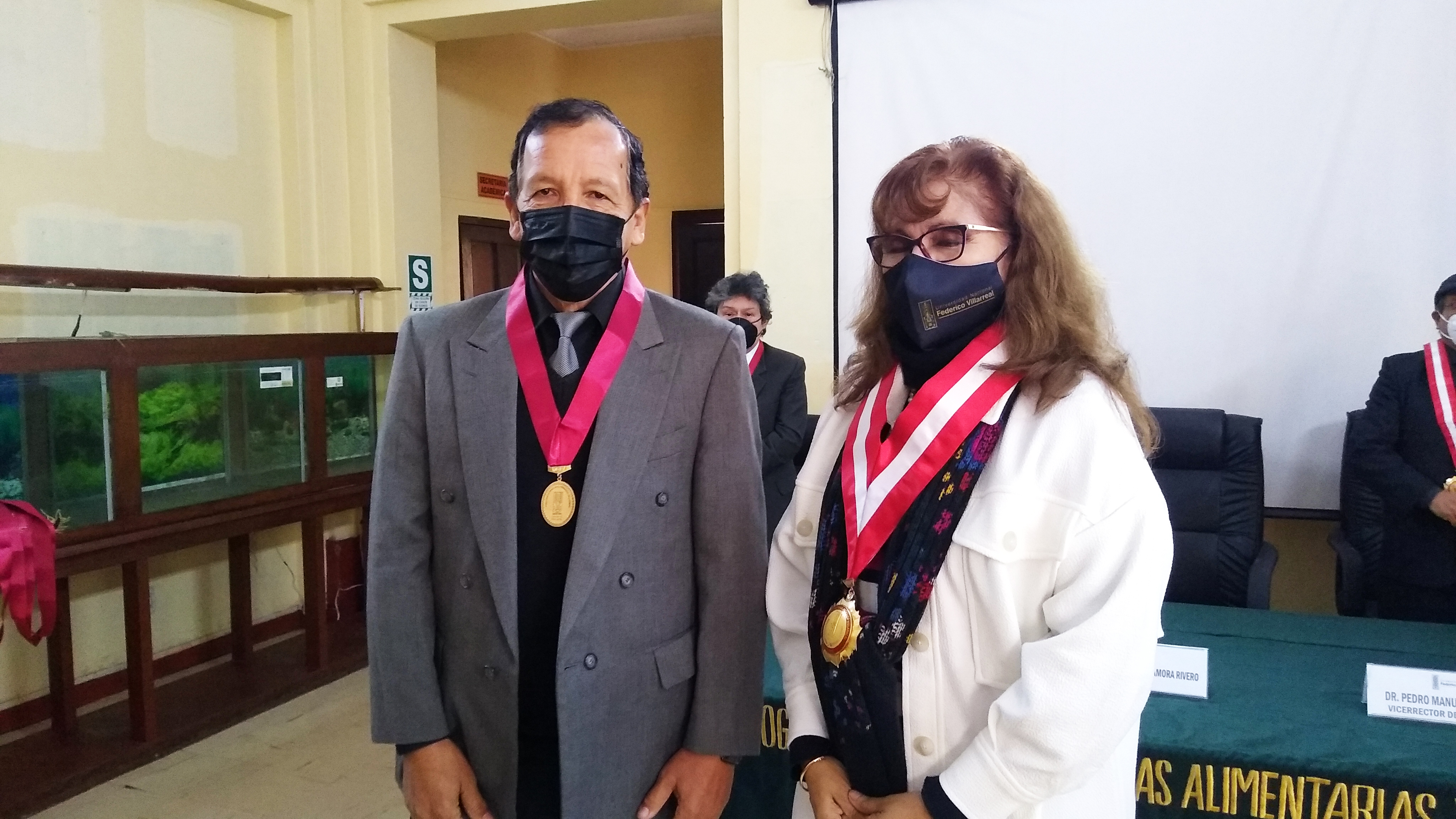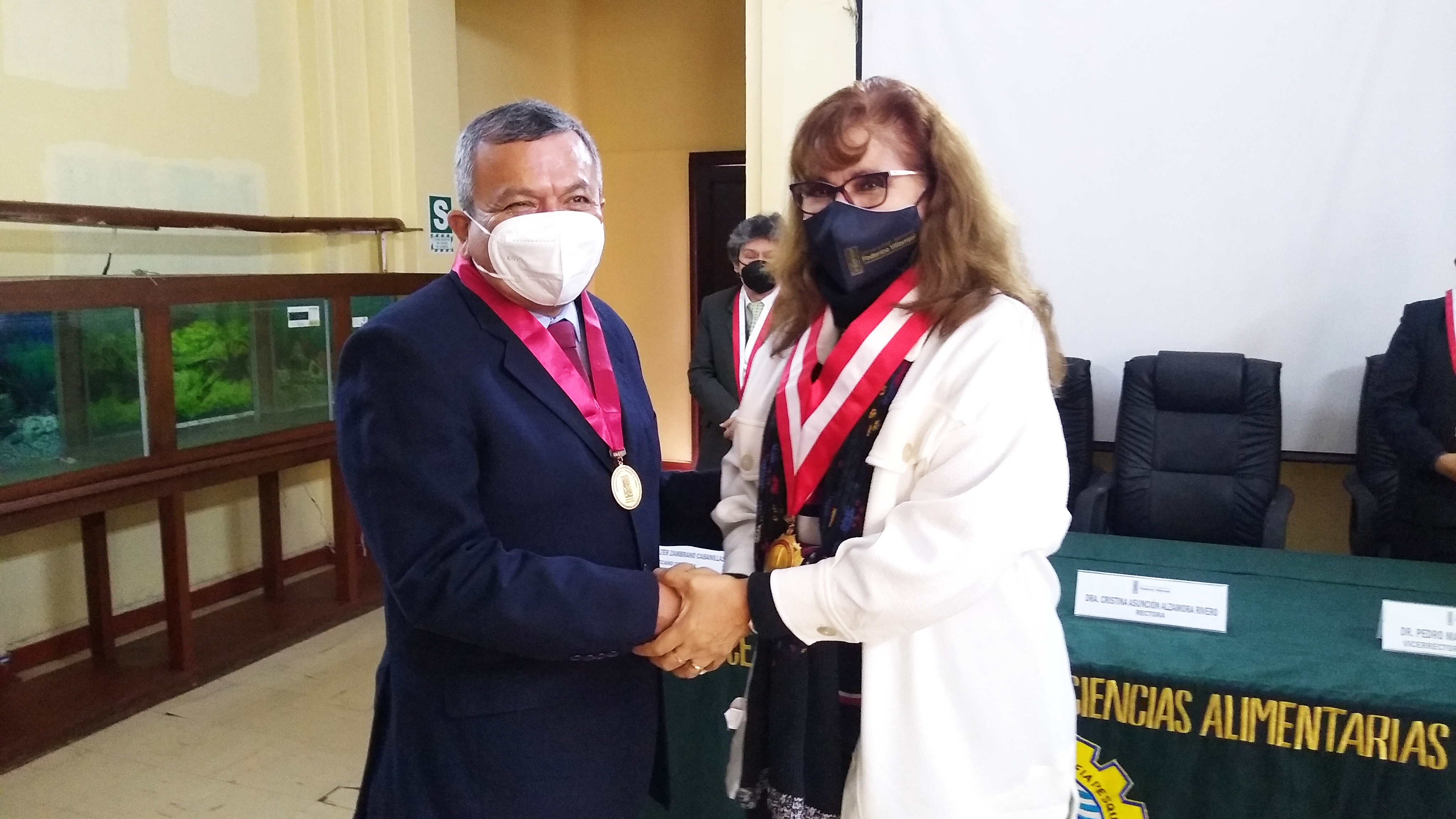 Imposición de medalla a nuestro docente Dr. Olegario Marín Machuca; ascendido a la categoría de principal por parte de nuestra rectora Dra. Cristina Asunción Alzamora Rivero. |