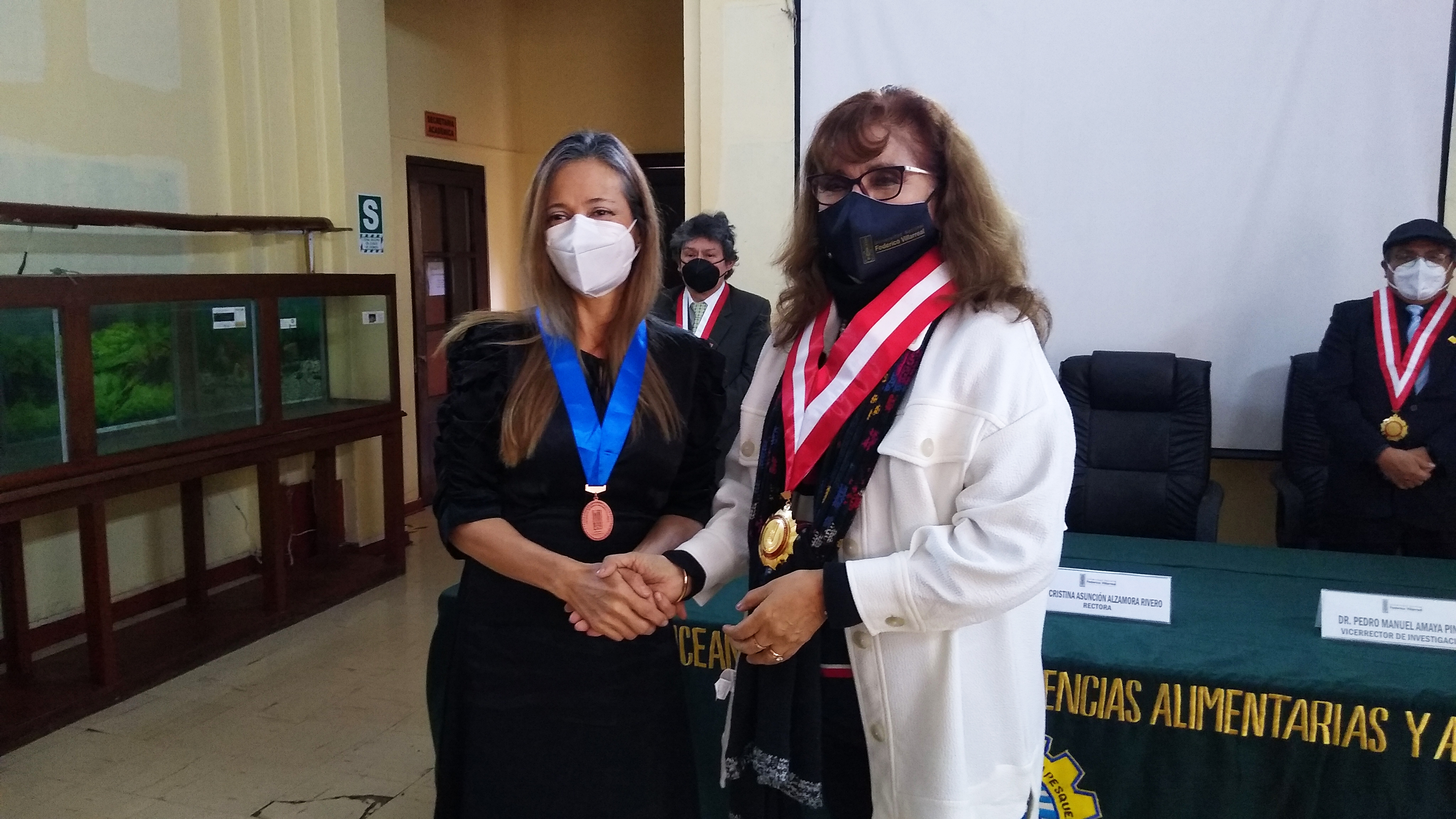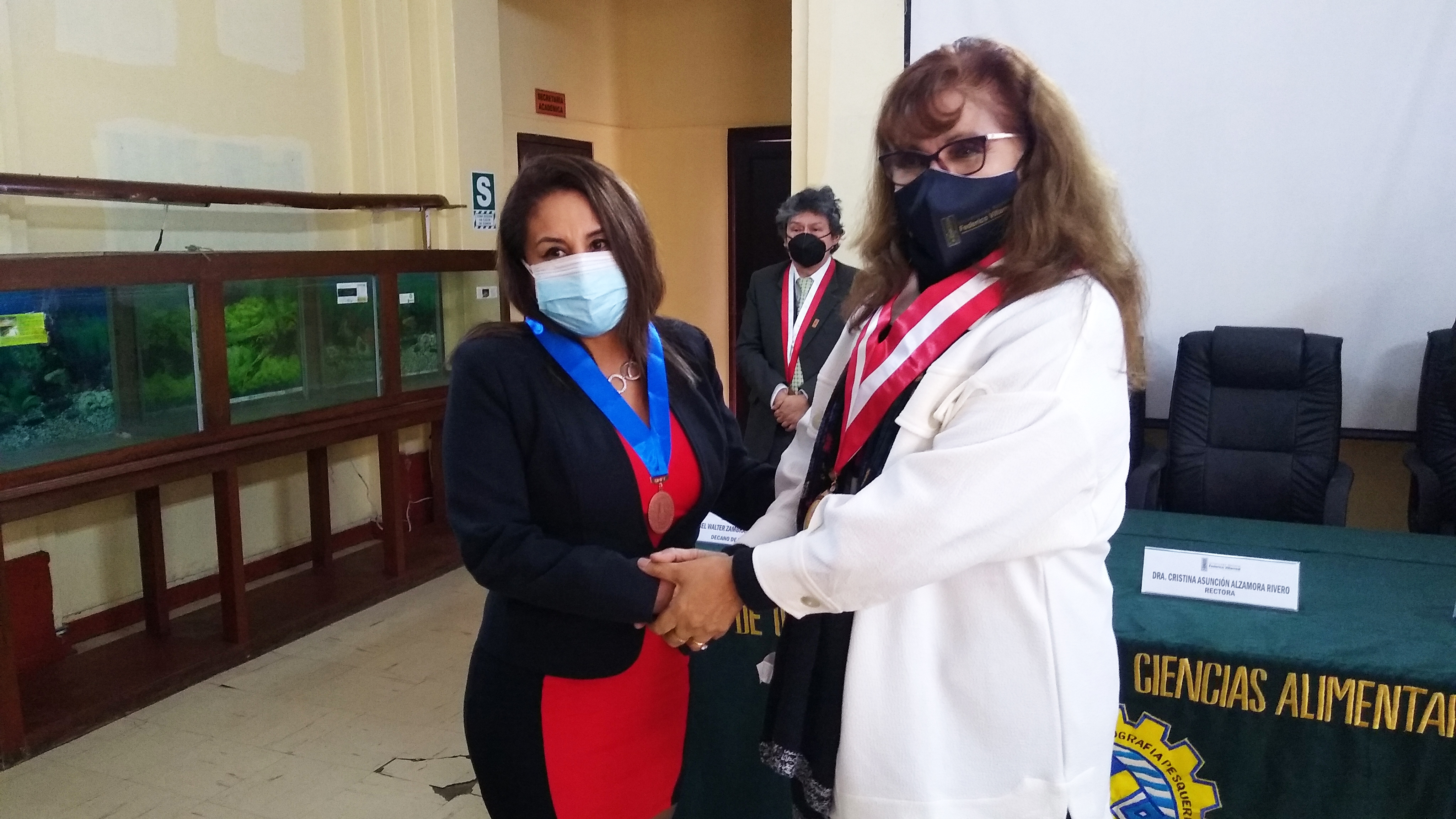 Imposición de medalla a nuestra docente Dra. Nilda Graciela Quispe Alvarado; ascendida a la categoría de asociada por parte de nuestra rectora Dra. Cristina Asunción Alzamora Rivero. |
